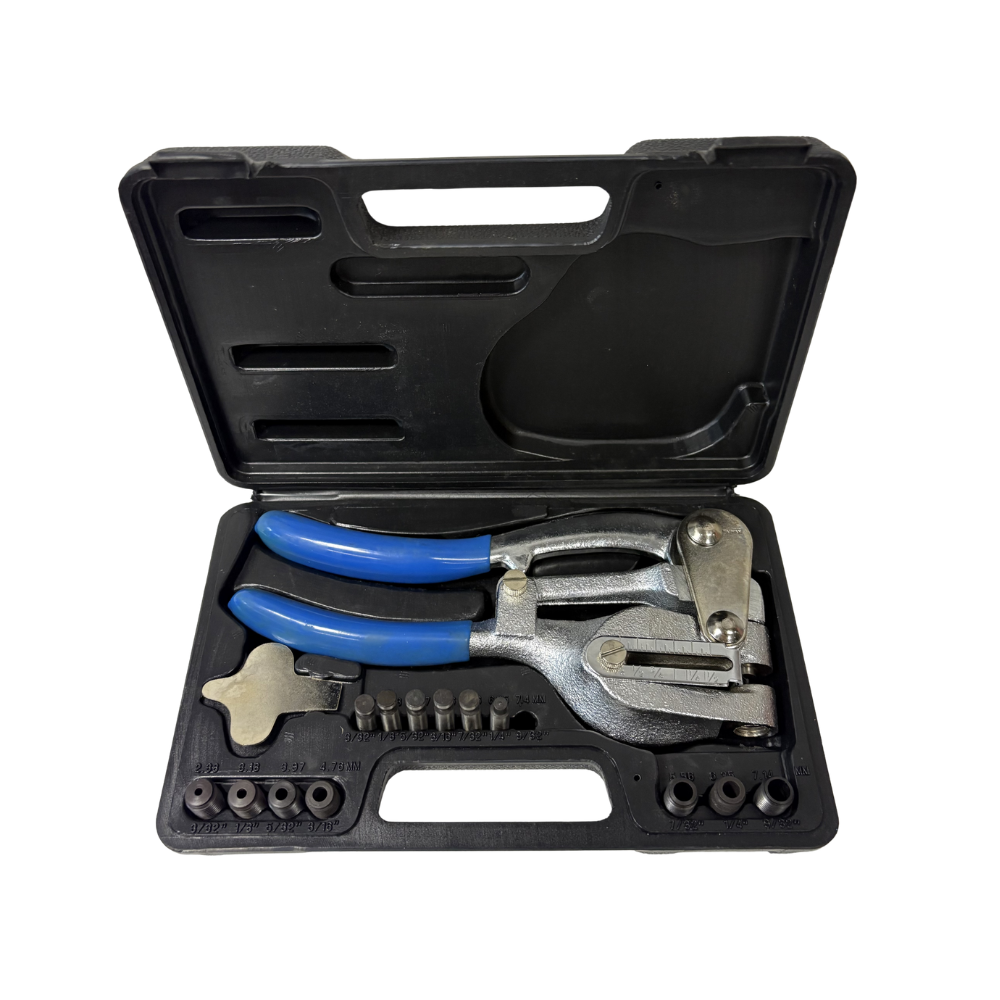 • Furnished with 7 sizes of round hole punches and dies: 3/32″, 1/8″, 5/32″, 3/16″, 1/4″, and 9/32″