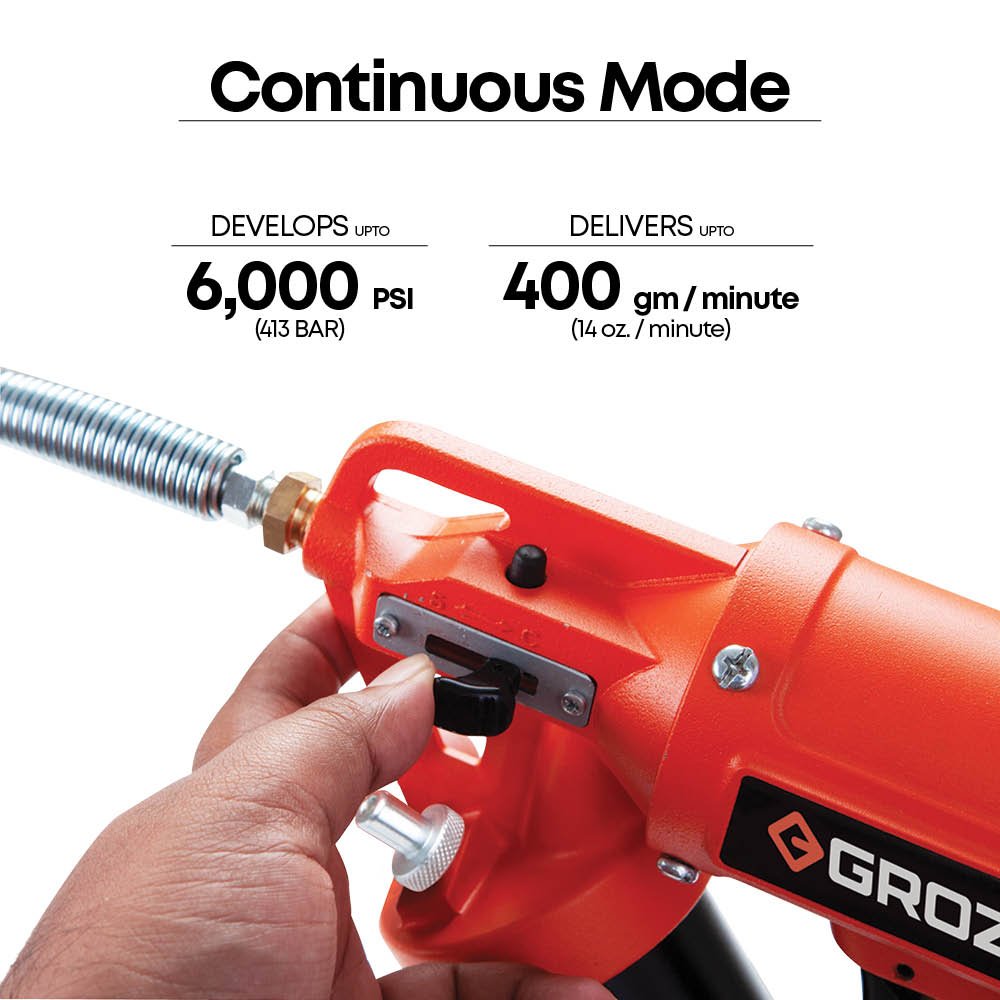 The Groz Dual Mode Air Operated Grease Gun is a unique tool that eliminates the need for two separate grease guns.