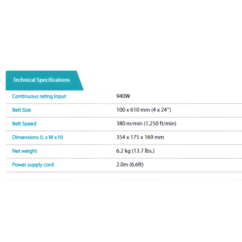 • 100 mm (4″) wide belt wtih a speed of 380 m/min (1,250 ft./min) for fast material removal