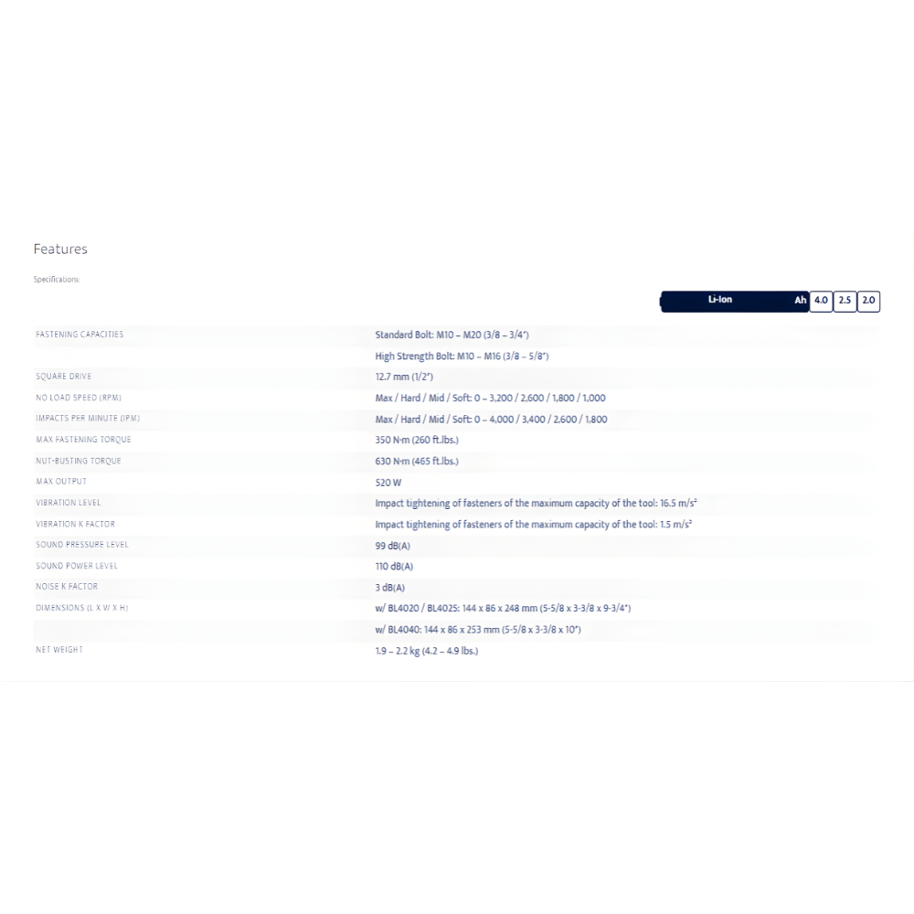 BL motor delivers 350 N·m (260 ft.lbs.) of max torque and 630 N∙m (465 ft.lbs.) of nut-busting torque