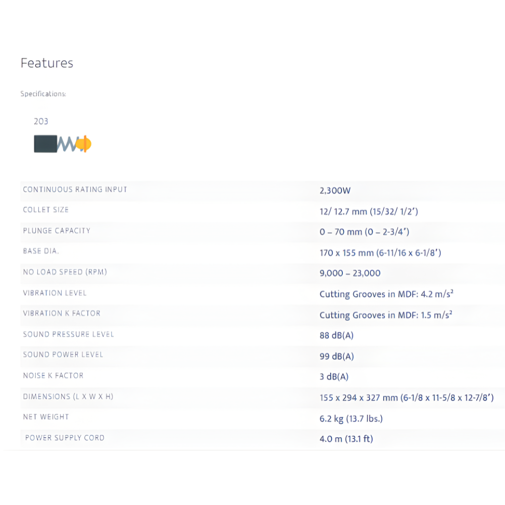 • 12, 12.7 mm (15/32, 1/2″) 2,100 W Variable Speed Plunge Router with Electric Brake, Soft Start, Twin LED Lights