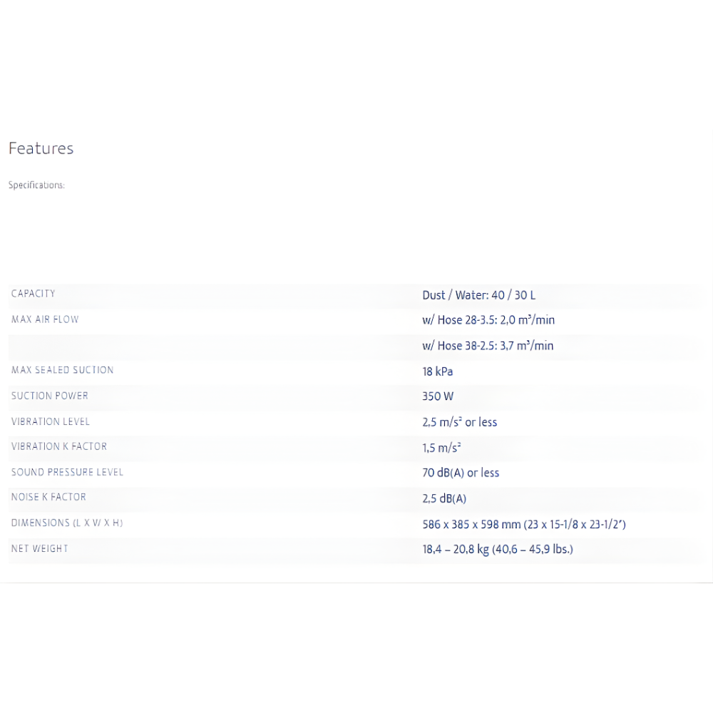Dust permeability: less than 0.1% (according to EN60335-2-69)