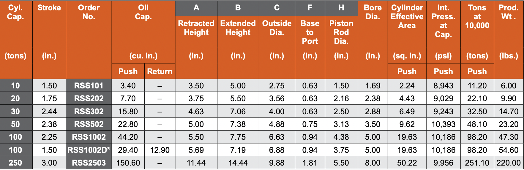 RSS1002 (100T, 2.25" Stroke), RSS202 (20T, 1.75" Stroke), RSS302 (30T, 2.44" Stroke), RSS502 (50T, 2.38" Stroke)