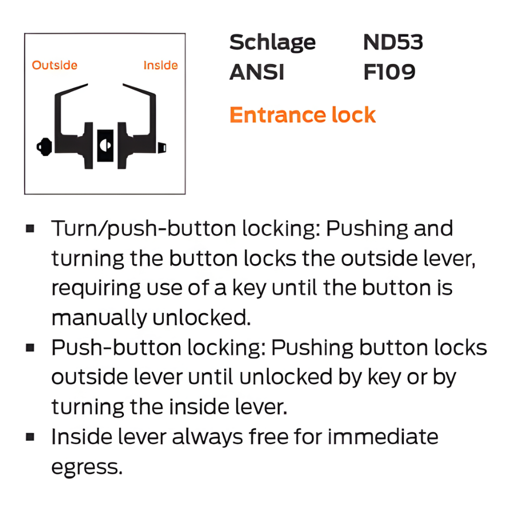 • ANSI Function F109 ? Turn/push button locking. Pushing and turning button locks outside lever requiring use of key until button is manually unlocked. Push button locking. Pushing button locks outside lever until unlocked by key or by rotating inside lever. Inside lever always free. Deadlocking latch bolt.