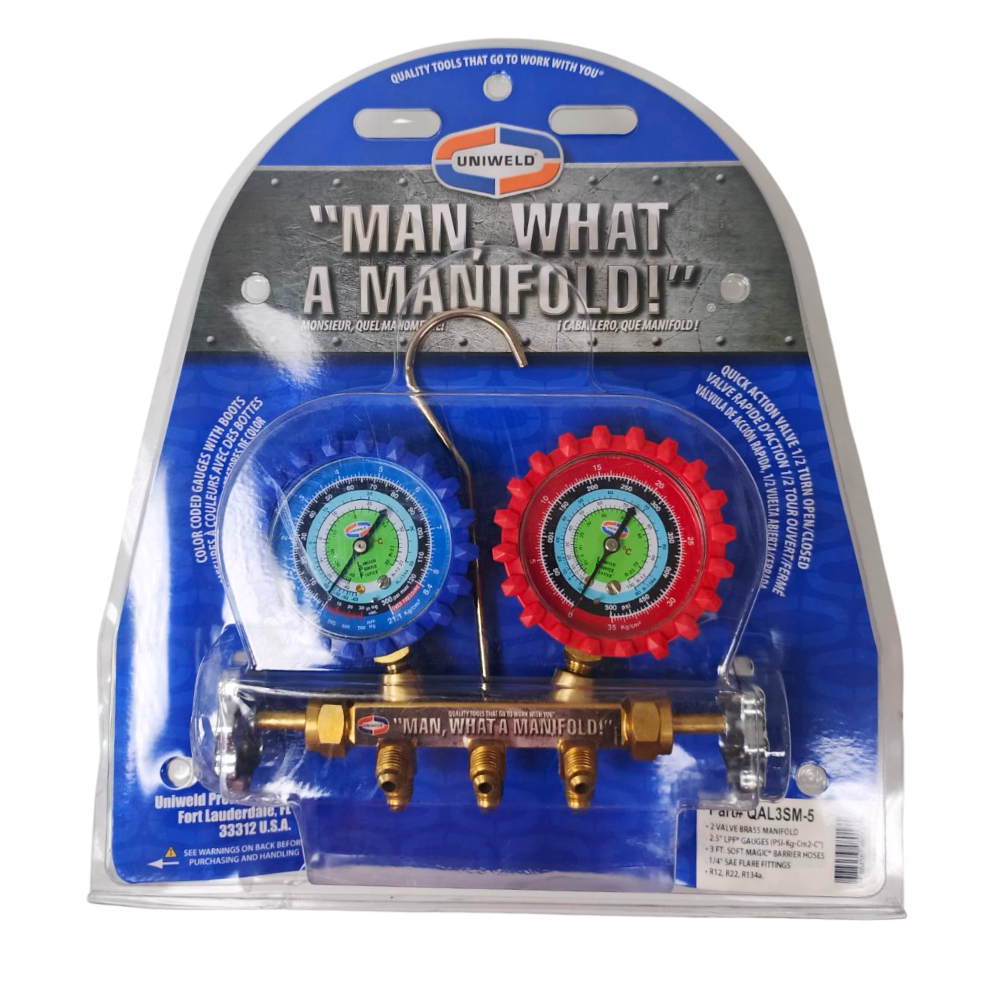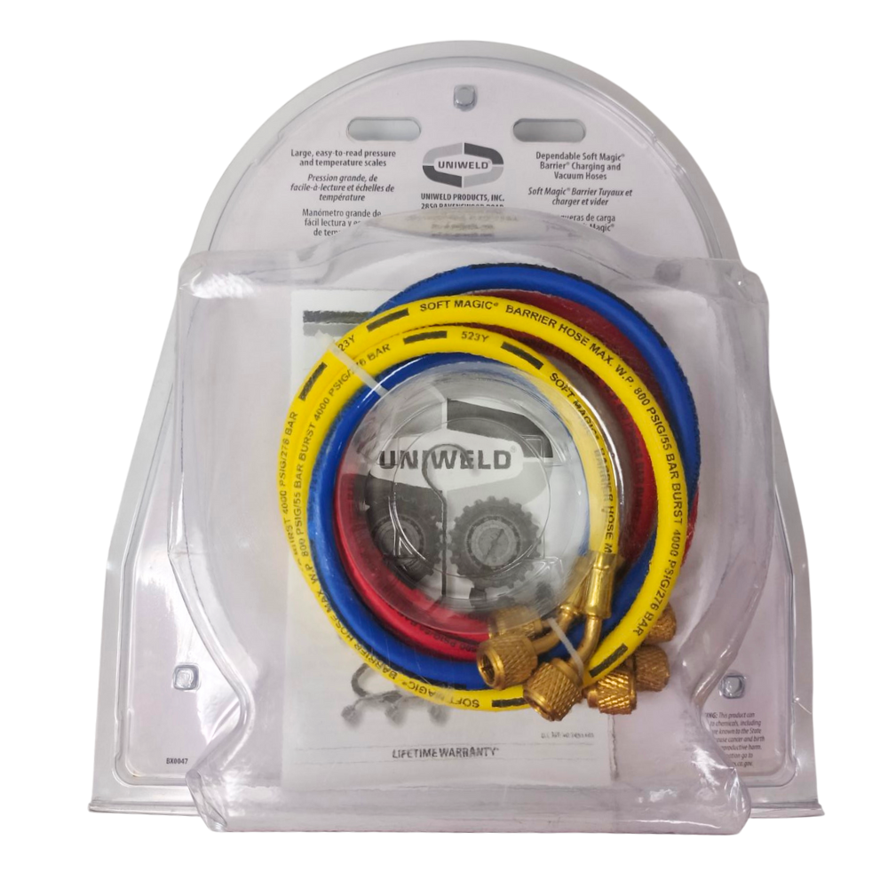 Extended valve stems for ample knuckle clearance metal hand wheels. easy access front hose holders 2 1/2” steel case LPF gauges with 3 refrigerants (R-134A, R-22, R-12) are easy to read and come with color coded protective gauge boots. Replacement gauges are available under Part# G29LD for RED and Part# G30LD for BLUE. Three 3 ft. Soft Magic Hoses included.