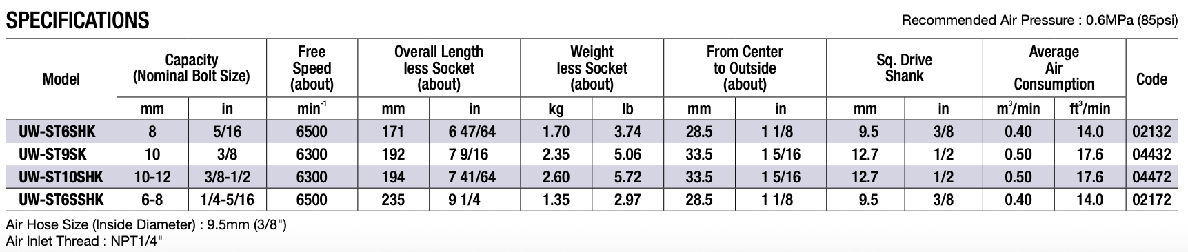 Uryu UW-ST Series Stud Bolt Pneumatic Impact Wrench Made in Japan