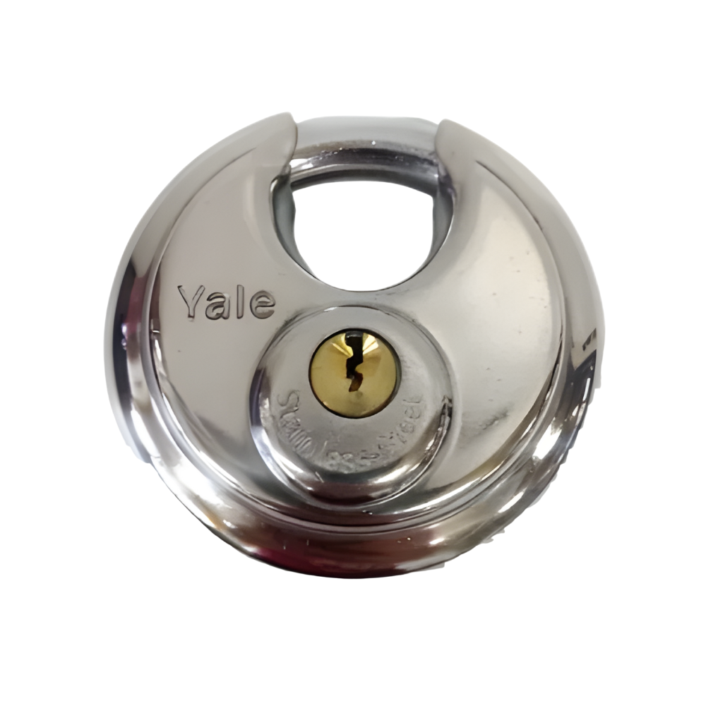 Authentic Yale MOON DISKUS ROUND PADLOCK Size: 70mm Anti-Cut Chrome Plated Hardened Steel Shackle Spring Loaded Keyhole Cover Suitable For Standard Security Application and Outdoor use Made in Taiwan